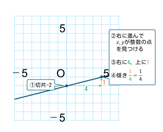 次に、切片から右に移動した、\(x\)座標、\(y\)座標が整数の点を、傾きを使って考えます。