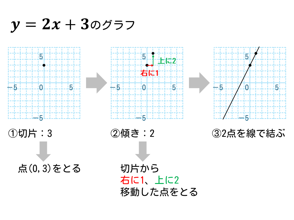 一次関数のグラフを描く手順は以下のようにまとめられます。