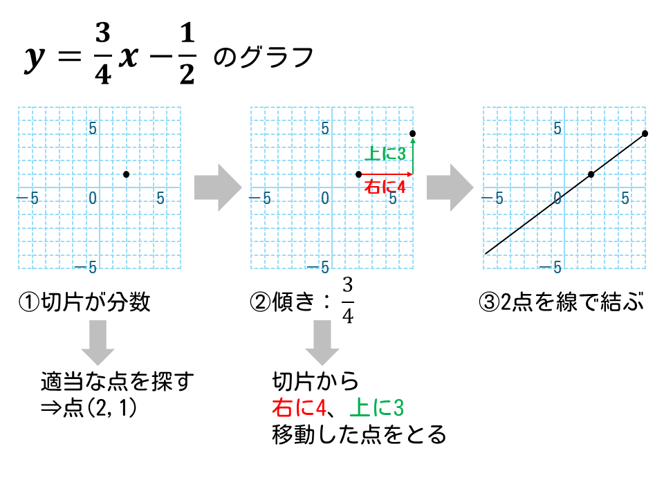 傾き、切片が整数、分数と分けて覚えるより、一つの手順としてまとめておく方がいいと思います。