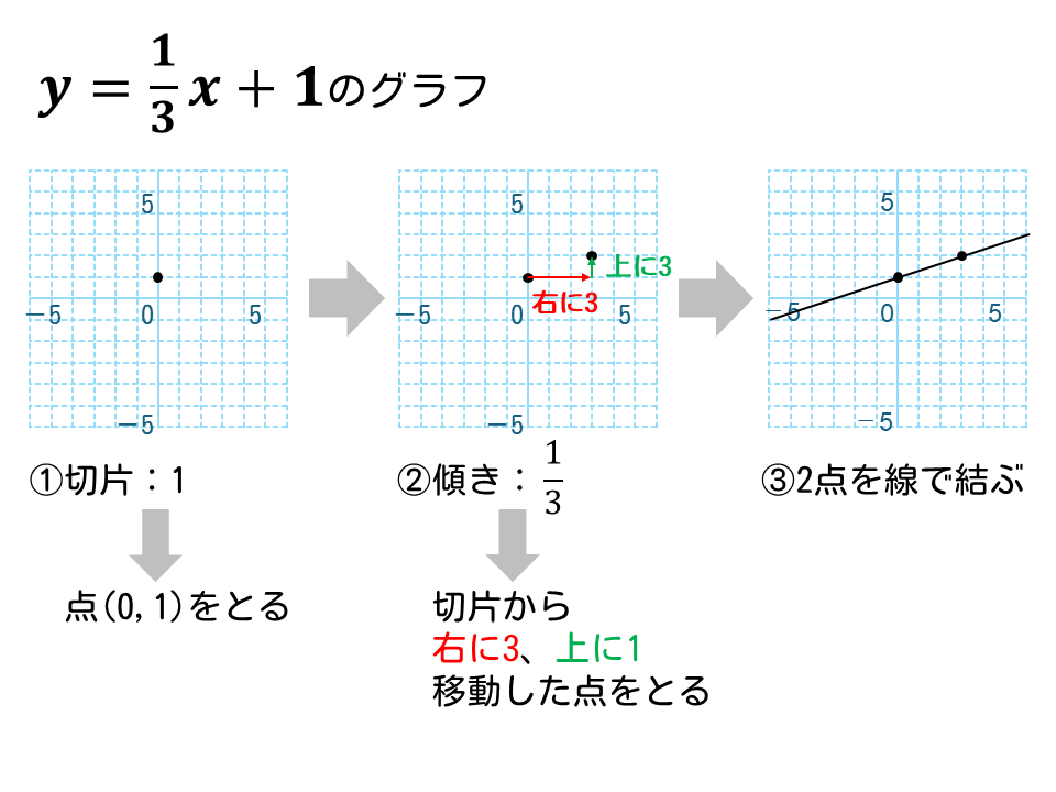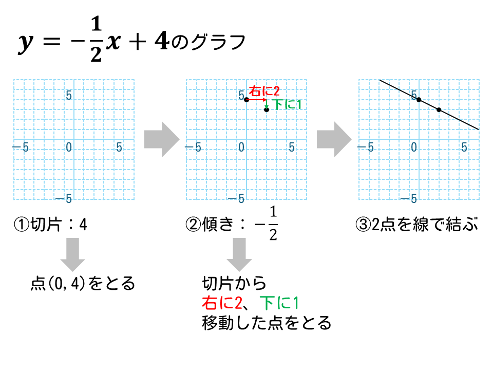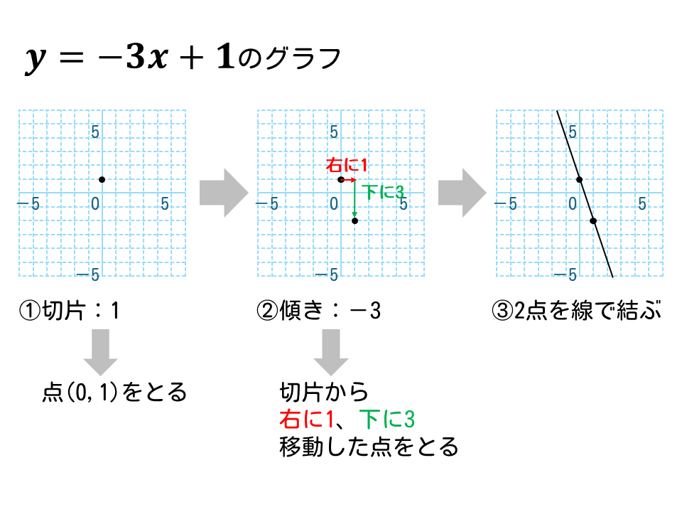 基本的には「切片をとる⇒傾きから次の点をとる⇒線で結ぶ」と思っておいてください。