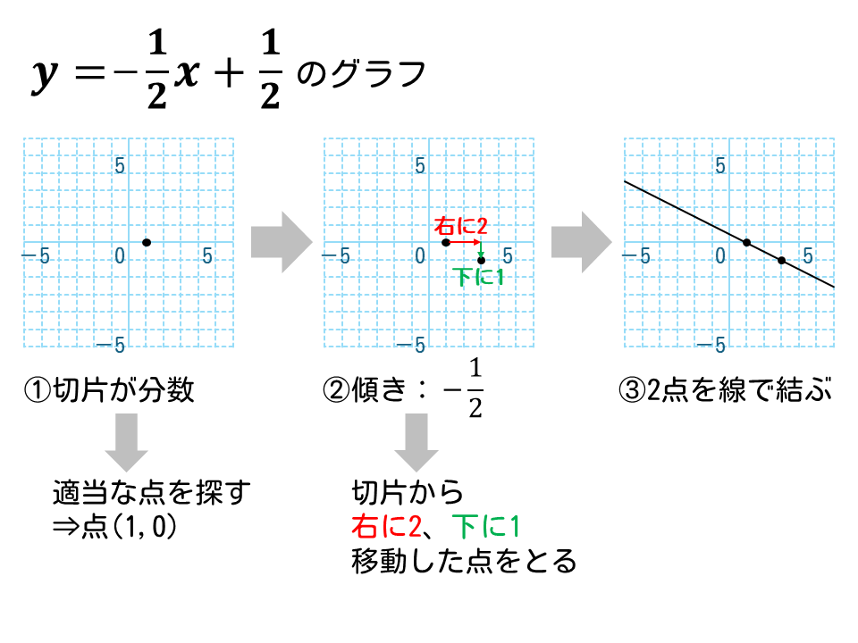 また、切片が分数のときの一次関数のグラフの描き方は、テスト当日に抜けやすいです。