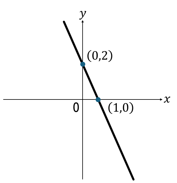 \(\displaystyle \text{傾き}=\frac{\text{yの増加量}}{\text{xの増加量}}=\frac{-2}{1}=-2\)