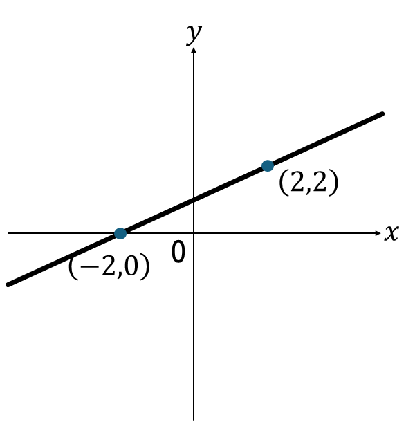 \(\displaystyle \text{傾き}=\frac{\text{yの増加量}}{\text{xの増加量}}=\frac{2}{4}=\frac{1}{2}\)