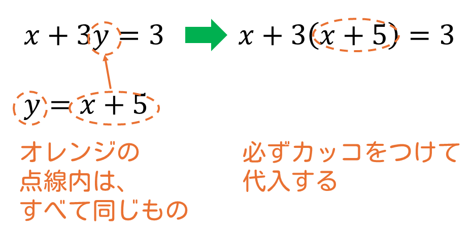 代入法を自由に使えるようになるためには、「\(x=○\)」または「\(y=○\)」の「○」の部分の式をひとかたまりとして見れることが重要です。